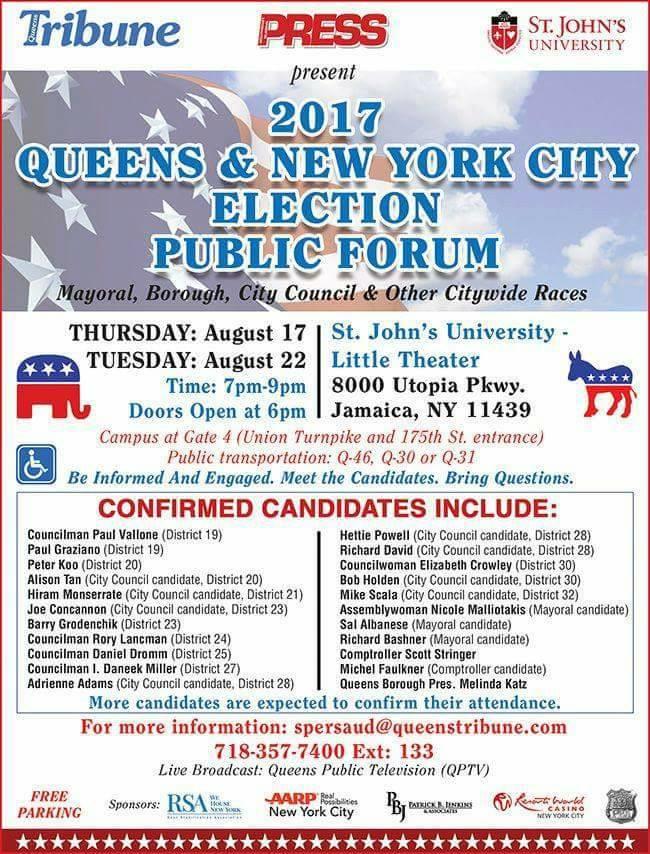 Thursday, August 17 and Tuesday, August 22 at St. John's University's Little Theater. Door opens at 6pm. Open to the public. All are advised to bring questions to ask local politicians. The two events are organized by Queens Tribune.