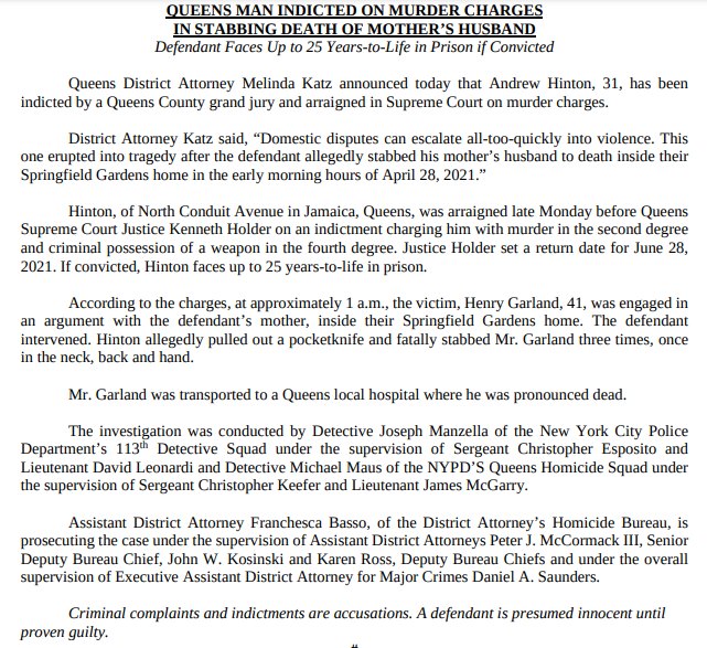 The Queens DA's office stated today the grand jury indicted the son who intervened and attacked his stepfather. This is during a domestic dispute inside their home with the mother. The son had no priors and was arrested on the scene when the incident was reported on April 27.