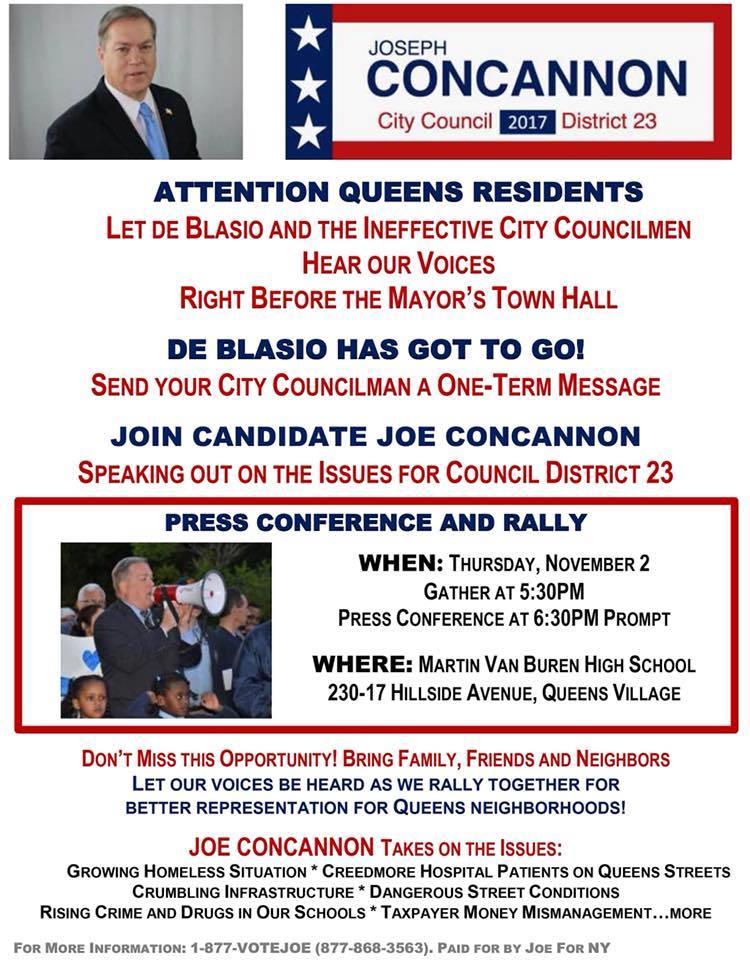 On the same day, November 2, Republican candidate for NYC Council Joseph Concannon will have rally and press conference in front of Martin Van Buren High School where Mayor di Blasio is having town hall. Open to the public.