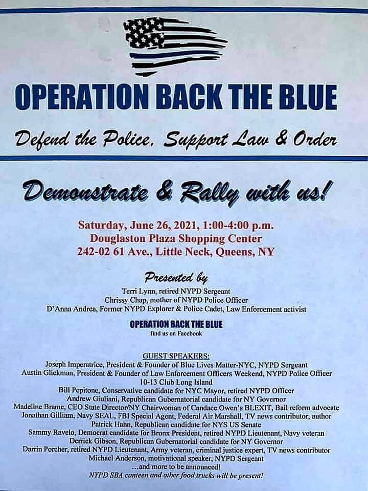 Saturday, June 26 from 1pm to 4pm inside the parking lot of Douglaston Plaza will have rally for Defend the NYPD. This event is open to the public. Traffic delays in the area. For GPS use 242-06 61st Avenue in Douglaston.