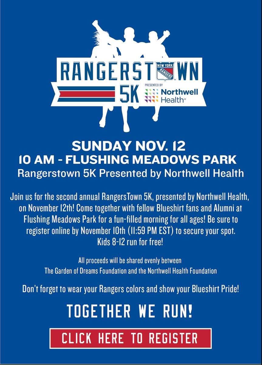 Sunday, November 12 at 10am in Flushing Meadows Park. Open to the public. Register before November 10. Here is the link, https://www.nhl.com/rangers/fans/rangerstown-5k-run