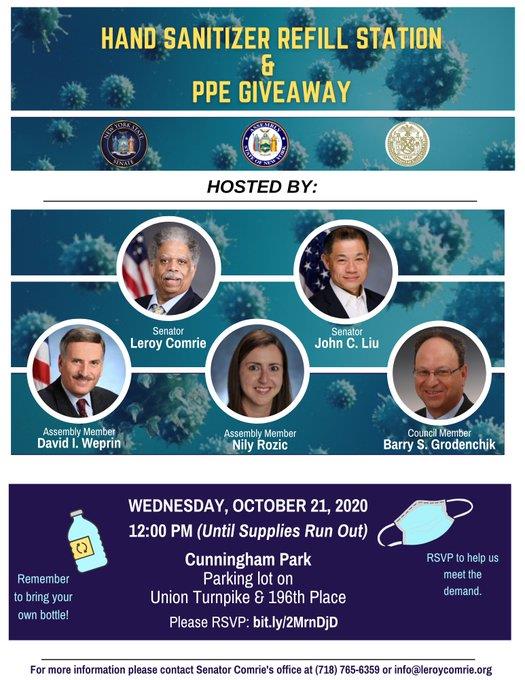 Wednesday, October 21 at 12pm, local elected officials announced refill station for hand sanitizers. PPE giveaway also and both are funded by working class. The entrance is on Union Turnpike and 196 Street in Fresh Meadows. Bring all the bottles you can while supplies last. Also, you can take selfies with government officials.