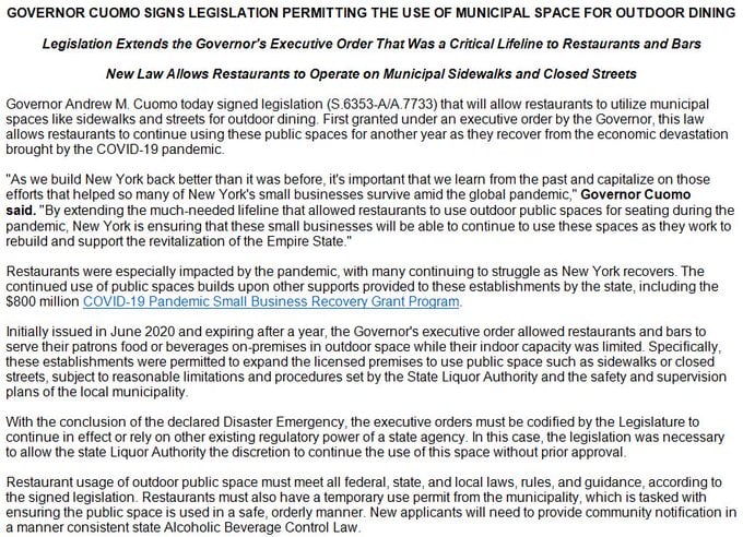 The NY governor extended the bill to allow restaurant owners to continue to use streets and sidewalks for outdoor dining. This includes NYC. The same rules and guidelines apply without changes. All new changes for restaurants must comply with local zoning laws. As for NYC, the mayor hasn't responded to this but will say he welcomes it.
