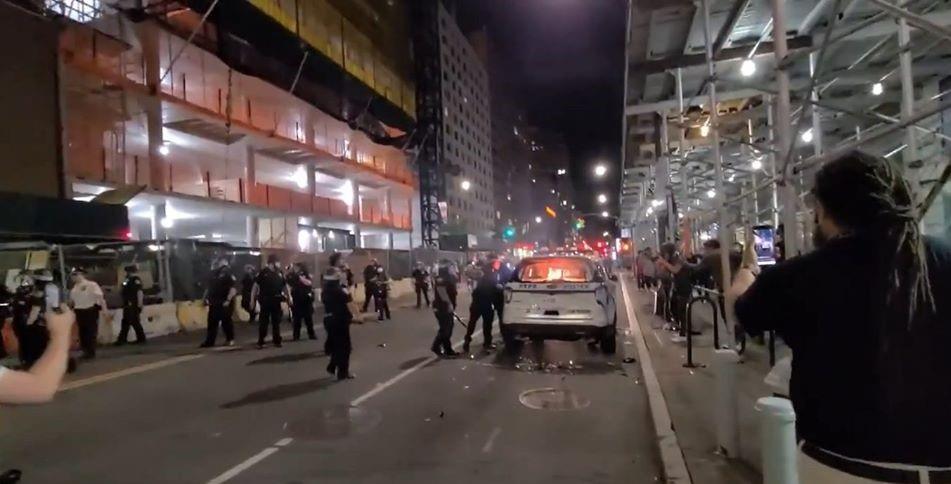 Police are at University Place and East 13 Street reporting multiple NYPD vehicles set on fire. The other one is at east 10 Street and another one at East 11 Street. Broadway in downtown Manhattan reported looting and assaults. Vandalism with multiple police officers injured. On East 12 Street, three police officers injured and taken to hospitals. More than 50 arrests in the vicinity.