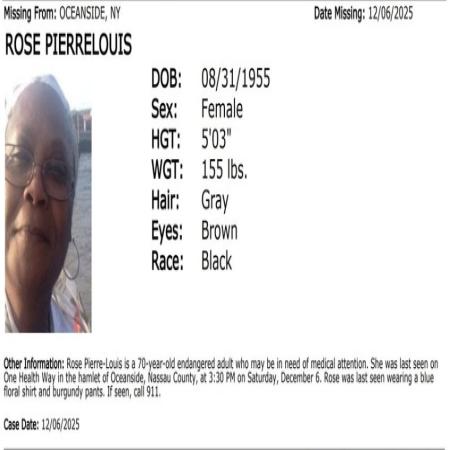 Rose Pierrelouis, F/B/70 from Oceanside, NY. Rose was last seen on One Health Way in the hamlet of Oceanside. The missing may be in need of medical attention.