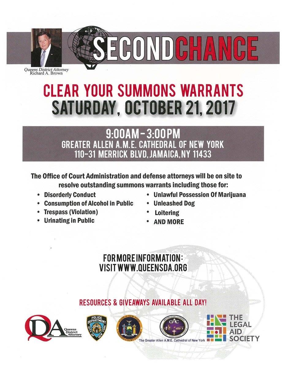 October 21 from 9am to 3pm. Open to the public. Legal from Queens DA's office will be on the spot to resolve pending issues for warrants from peeing in public to drinking in public.