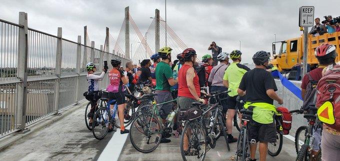 Today around 12pm, The Kosciuszko Bridge's second span has its grand opening with Governor Cuomo and local elected officials. The first cyclists and pedestrians were on the bridge to use the new walkway/bikeway on the bridge.