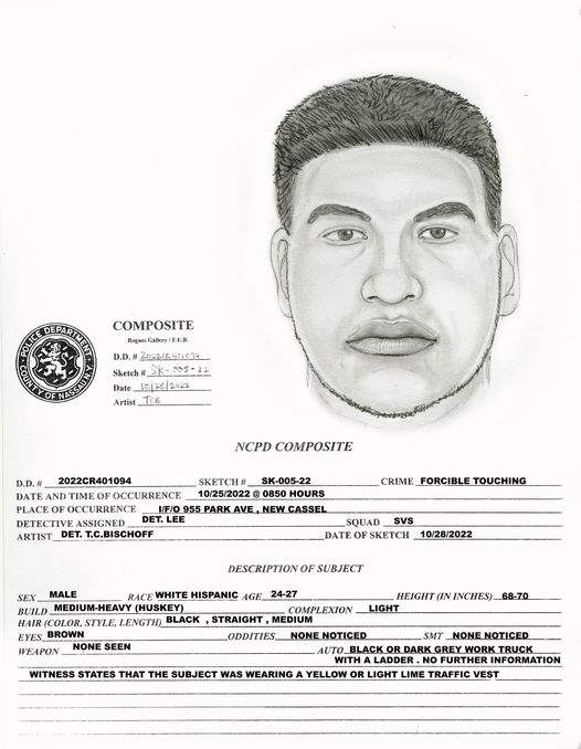 The Special Victim’s Squad is investigating a sex offense that occurred on Tuesday, October 25, 2022, at 8:50 am in New Cassel, Nassau County.