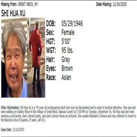 Shi Hua Xu is an endangered adult and was last seen in the Village of Great Neck on Tuesday, December 16. She was last seen wearing a red jacket, dark colored pants, and dark colored shoes as pictured. She is known to frequent the Bayside area.