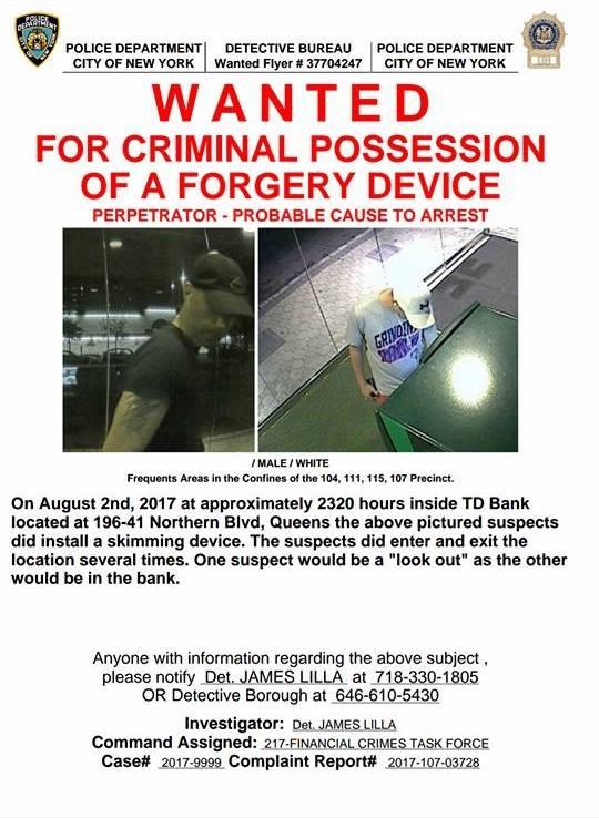 Auburndale - Police are searching for two suspects wanted for installing skimming device inside TD Bank at 196th Street and Northern Blvd. Anyone found irregularities in their account, please call the customer service.