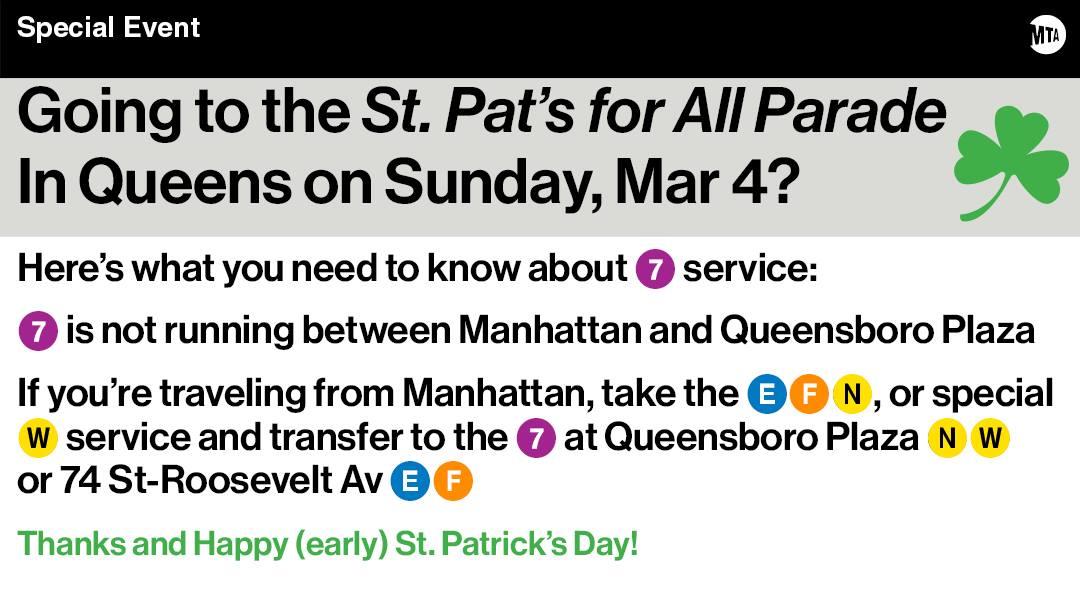 Sunday, March 4 at 1pm. The parade starts at 43rd Street and Skillman Ave to 58th Street and Woodside Ave. Open to the public.