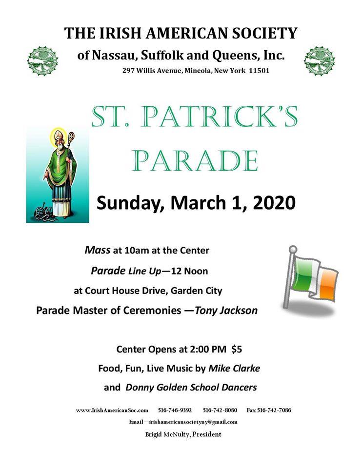 For March 1, there are 3 in Garden City, Bethpage and East Islip. For Garden City, see the flyer. For East Islip, the parade starts at 2pm in front of the public library. For Bethpage, King Kullen HQ on Central Ave. west at 2pm. For March 7, two events in Kings Park and Westhampton Beach. For March 8, also 2 events in Huntington and Hofstra University. For March 14, Bayshore and St James. For March 15, Farmingdale, Center Moriches, Miller Place, Blue Point and Ocean Beach will have parade. March 21 at Brentwood. For March 22, Patchogue, Wantagh, Glen Cove and South Shore. All events are open to the public.