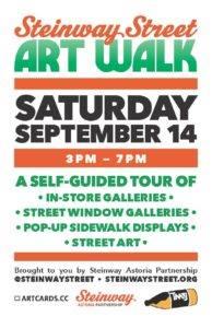 September 14, 2019 from 3pm to 7pm on Steinway Street between 28th & 34th Avenue in Astoria. The event kicks off at Long Island City Kleaners located at 30-53 Steinway Street, where art lovers can pick up their guidebook for the art walk designating all the in-store galleries, street window galleries, pop-up sidewalk displays and street art locations. Open to the public.