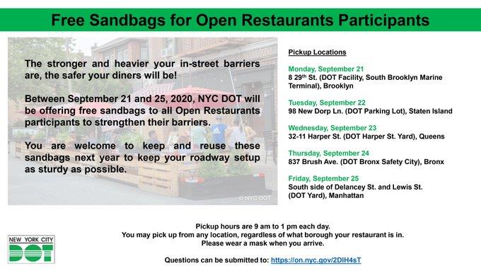 NYC's health inspector has a new assignment. For outdoor dining, the wooden barriers setup must be 18 inches deep and not another point inch. Flowers with pots can be added on top for the public to view and smell the fresh aroma or even take selfies with a peace sign. It's better than vehicle fumes while being outside. For restaurants on budget crisis, free sandbags are being given away by NYC DOT for outdoor dining. The sandbags will make barriers stronger and heavier. Check for the distribution and Queens has the event on September 23.