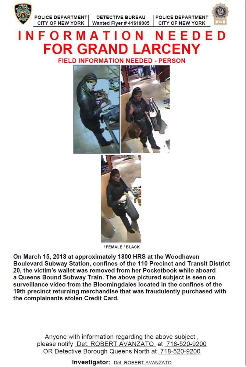 On March 15, a female suspect stole a victim's personal items while commuting inside subway heading to Queens bound at the Woodhaven station. Police reported the same suspect maybe responsible for additional thefts of more victim's personal belonging heading to Queens inside the train during rush hour. Commuters are advised to be aware of their items.