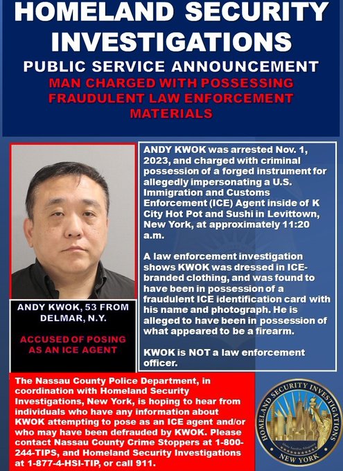 The NCPD reported a suspect who was inside an eatery in Levittown accused of acting as an ICE agent was taken into custody.