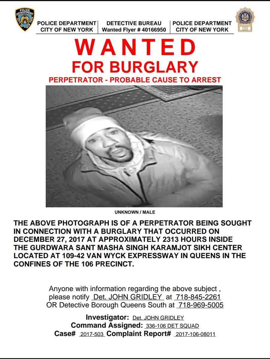 The incident happened on December 27 after 11pm at the Sikh temple in 109-42 Van Wyck Expressway in Richmond Hill. Police released the suspect's pic to the public for help.