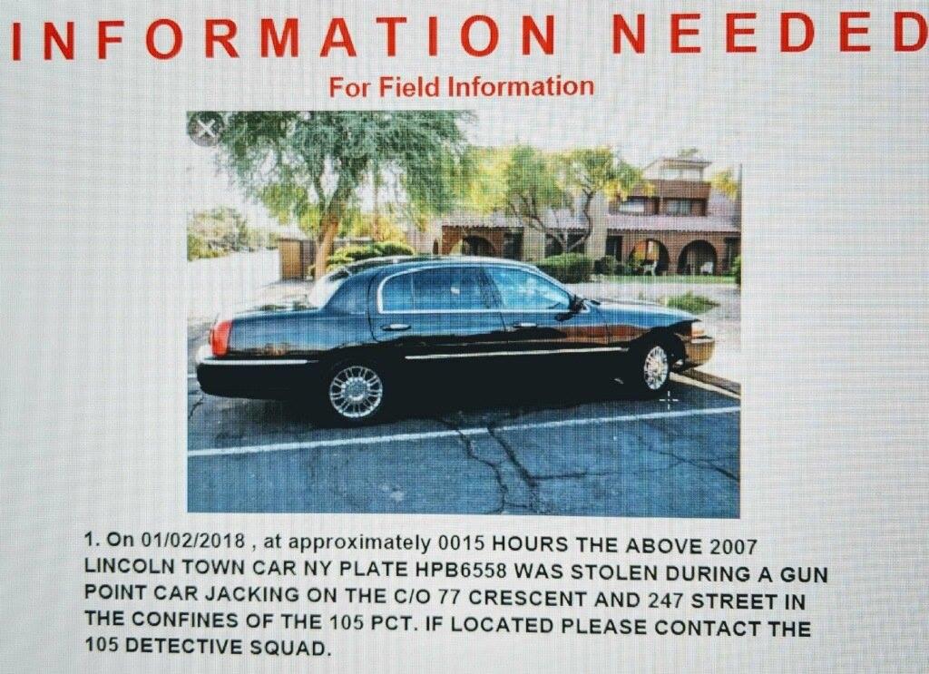 The incident happened on January 2 after midnight in Glen Oaks Village Co-op. The location is 247th Street and 77th Crescent. The vehicle was stolen seen in the picture and two victims were robbed. Ongoing investigation.