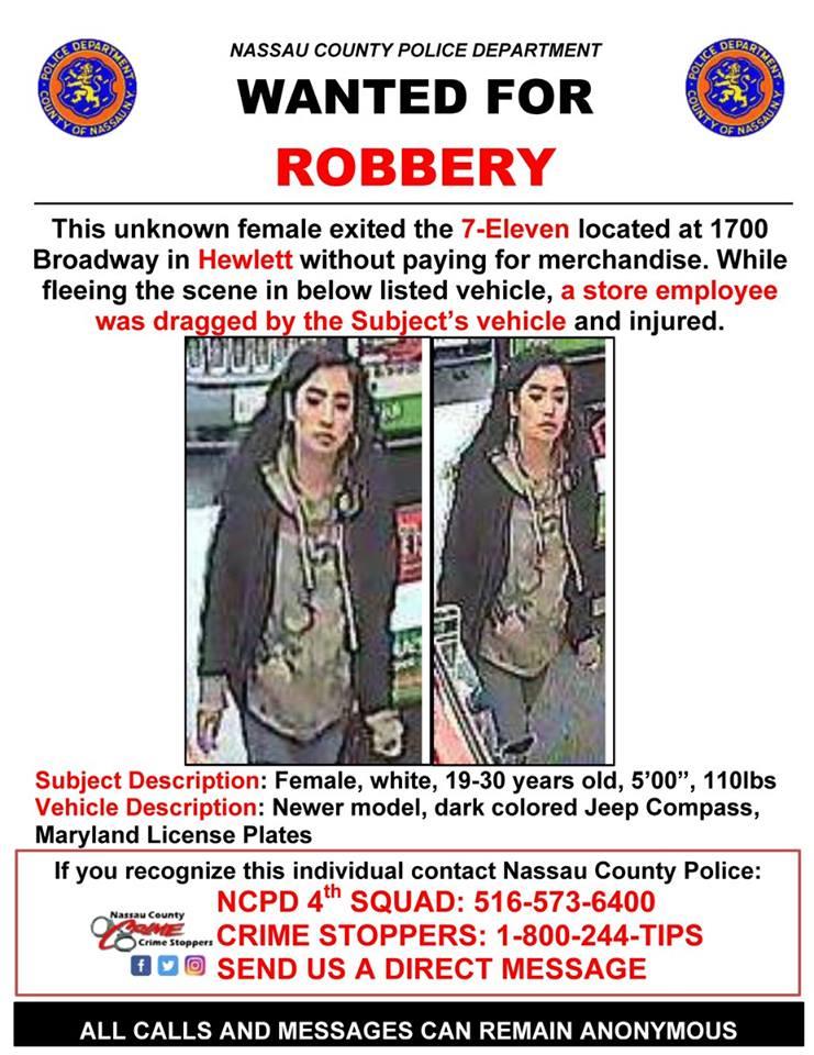 Police reported a female suspect is wanted for robbery and dragging a store employee with the vehicle.