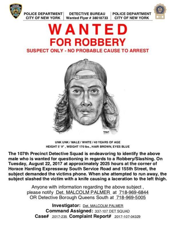 NYPD issued a public notice of sketch of suspect wanted for robbing and slashing a 15 year old female victim in Fresh Meadows. It happened on August 22 around 8:30pm at the intersection of Horace Harding Expressway and 155th Street. Suspect is male, white, 40 years old. Ongoing investigation.