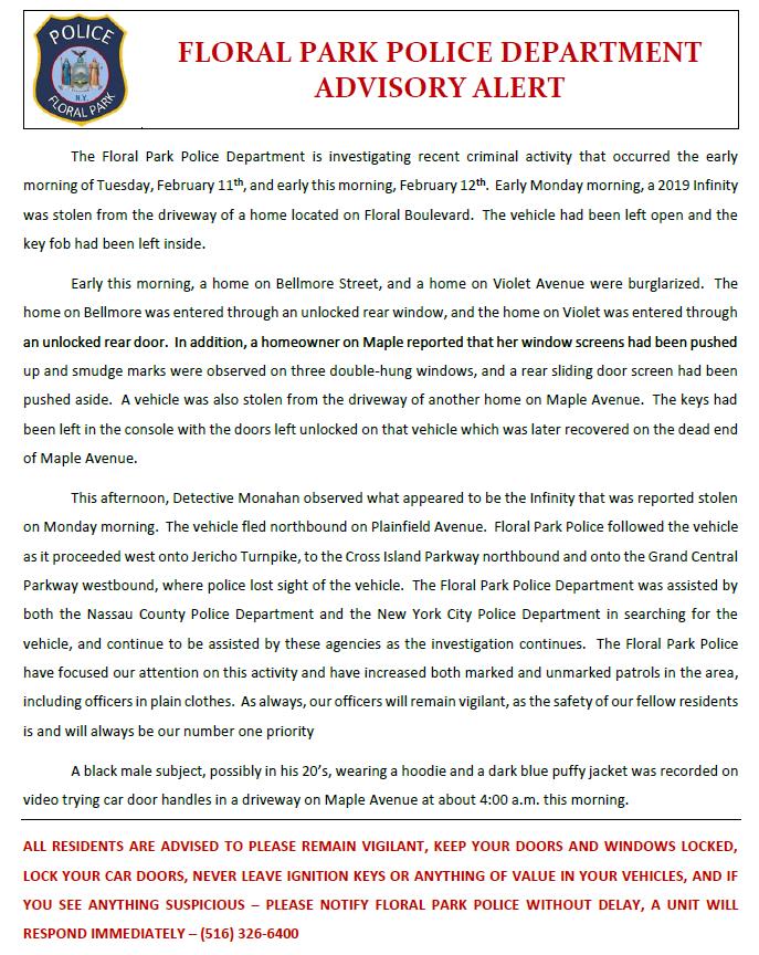 Update - Floral Park police also reported of burglaries after releasing statement to the media.