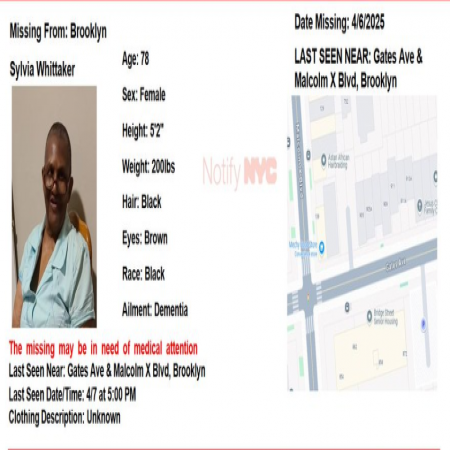 Sylvia Whittaker, female/black/78, from Gates Ave & Malcolm X Blvd, Brooklyn. Missing has dementia & may need medical attention.