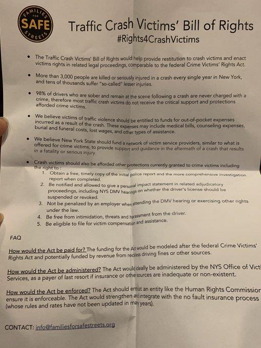 The NYS member of Assembly and Senate are reviewing the new proposal, Traffic Crash Victims Bill of Rights introduced today. The proposal was brought forth by Families for Safe Streets, The proposal has not been drafted into legislature after several politicians questions of drivers with full coverage. The proposal would only act against drivers without full coverage due to strong insurance law. Most people can't afford full coverage. Due to insurance loopholes, most politicians are opting out of the proposal but its a lengthy process for some who are considering to work on it. Also insurance companies continue to lobby for stronger advantage to their match. Lobbying is a legal term used to "bribe" politicians same as donations for campaigns.
