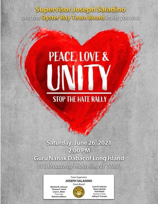 Saturday, June 26 at 2pm, there will be a rally on South Broadway in Hicksville. This is for peace, love and unity. Also this is a great chance for local elected officials to show up for the next election. The NCPD will be on the spot to coordinate traffic. Open to the public.