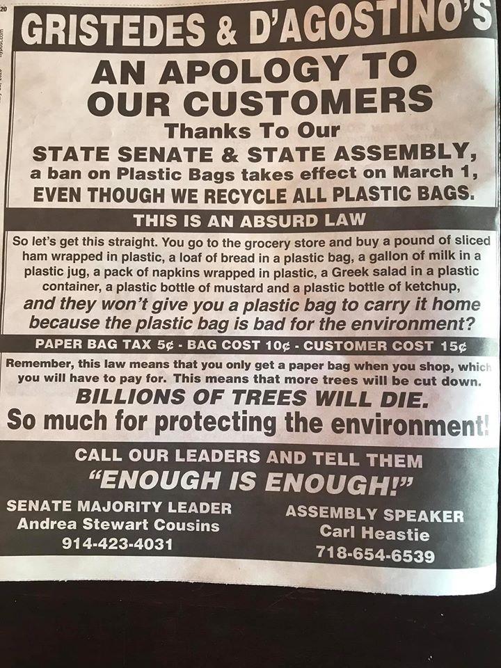 The grocery chain Gristedes and Dagastinos placed ads in local papers with apology for using paper bags instead of plastic. The outline shows more trees will be killed and urging all to call elected officials.