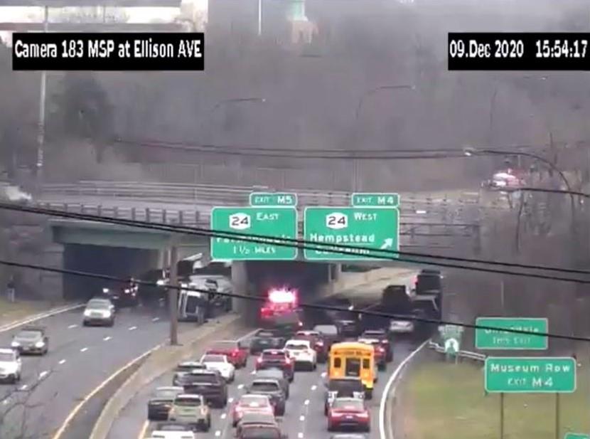Police are on the Meadowbrook State Parkway northbound at Hempstead Turnpike reporting an unauthorized truck flipped after hitting the bridge. Heavy delays in both directions. EMS is checking on the driver.