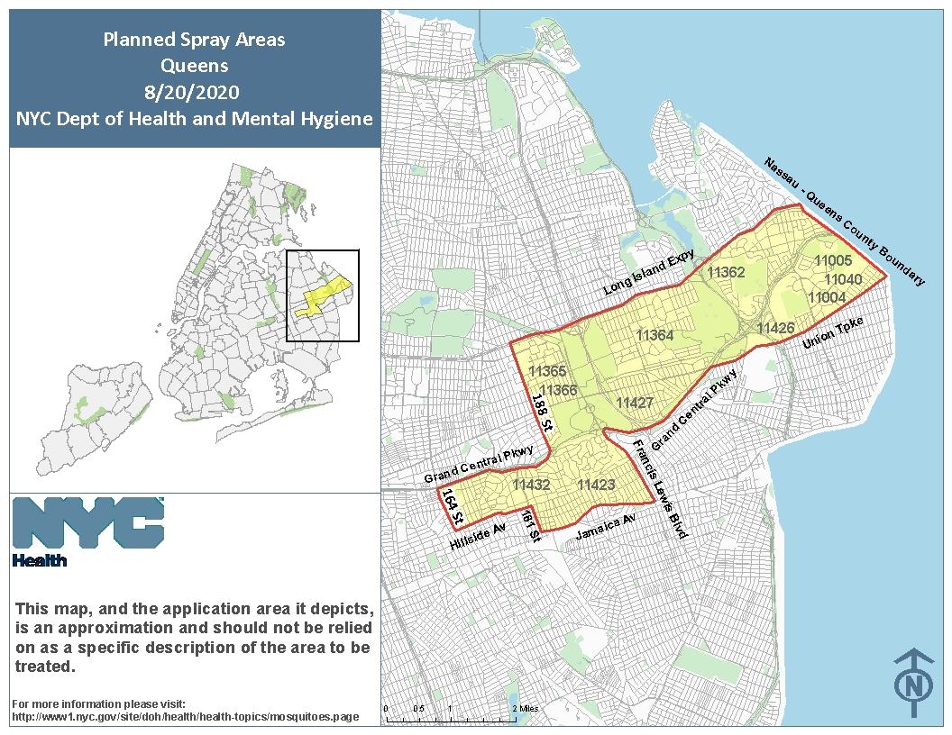 The NYC Dept of Health confirmed today from 8:30pm to 6am tomorrow morning, trucks will be spraying pesticides to reduce mosquito activity and the risk of West Nile Virus. The locations are parts of Fresh Meadows, Glen Oaks, Hollis, Hollis Hill, Holliswood, Jamaica Hills, Little Neck, and Oakland Gardens. Zip codes are 11004, 11005, 11040, 11362, 11364, 11365, 11366, 11423, 11426, 11427 and 11432. People are advised to stay indoors and keep the windows closed.