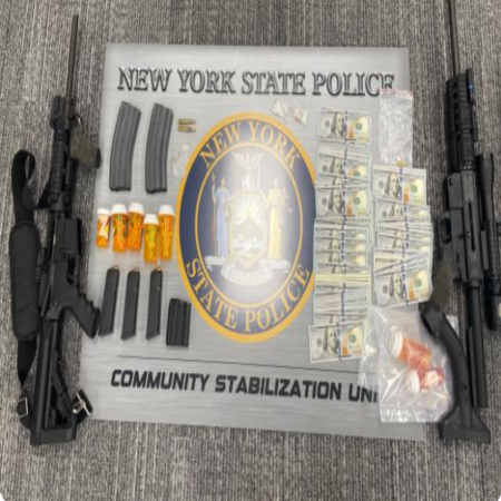 The search led to the seizure of an illegally possessed assault rifle, a New York-compliant assault rifle, two high-capacity magazines, more than 100 amphetamine pills, multiple multicolored methamphetamine pills, $7,218 in U.S. currency, various rounds of ammunition, and compliant firearm magazines.
