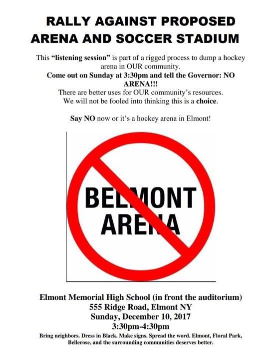 On Sunday, December 10 at 4pm, Pro Belmont will showcase two companies bidding for redevelopment of racetrack with new stadium proposal. The proposal is part of new home for NY Islanders and/or soccer stadium. The same day around 3:30pm, Con Belmont will be protesting against the redevelopment due to low quality jobs and heavy traffic congestion. The Pro event will be held inside Elmont high schol and Con outside. Both events are open to the public.