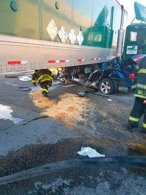 Rosedale - JFK traffic is a mess after two people pinned inside their vehicle after struck under a tractor trailer. NYPD, EMS, FDNY are on the scene. Chopper is hovering above at Brookville Blvd and Rockaway Blvd. Witnesses stated driver of tractor trailer was making wide left and the driver of car, a Dodge sedan tried to overtake the front. Instead the vehicle went under the truck. Police reported both driver and passenger were pinned inside and removed taken to hospital. Both are in critical condition. Third person in the car refused medical attention along with the truck driver. The truck driver is cooperating with police. Area closed. Ongoing investigation. Reported 7pm.