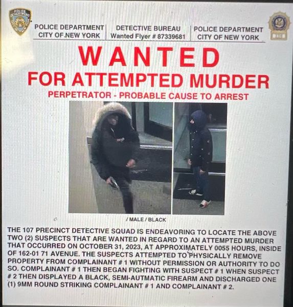 The NYPD released surveillance pictures of two suspects wanted for attempted murder. The incident was reported on October 31 around 1am at the lobby of a building on 71st Avenue near 164 Street in Kew Garden Hills. Two people shot, 28 year old and a 61 year old males.