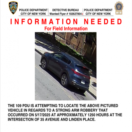The vehicle described below has been involved in multiple robbery or grand larceny incidents on the 109 PCT. The perps forcibly took victims’ necklaces/watches or stole victims’ necklaces when swapping a fake one on their necks.