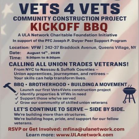 A new project aimed to help veterans around NY from NYC to Long Island is calling all to participate in the kickoff project with barbecue in Queens. The event will be held on Thursday, August 14 from 5:30pm to 8:30pm at the local VFW, 247-37 Braddock Avenue in Queens Village.
