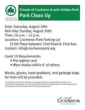 There is a park clean up event in Bayside's Crocheron Park. It's on Saturday, August 29 from 10am to 12pm. All volunteers must pre-register by sending email to info@crocheronpark.org with name. The meet is at 215 Place between 33rd Road and 33rd Avenue. Open to the public.