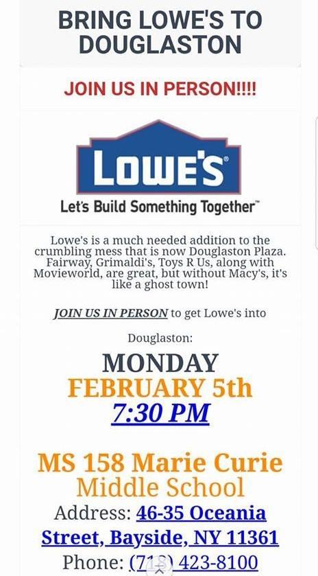 The Community Board 11 will take vote on Monday. February 5 at 7:30pm to decide whether to consider Lowe's replacing the former location of Macy's inside Douglaston Shopping Center. Also, a group of residents are supporting Lowe's rather than keeping it empty and they sent out flyers inviting all to attend for support