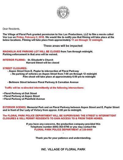Friday, February 2, all day, Floral Park Village road closures and other announcements for the filming of Vox Lux starring Natalie Portman and Jude Law. Magnolia Parking lot, Bellmore Street from Carnation Avenue to Floral Parkway and Aspen Street will be closed for filming.