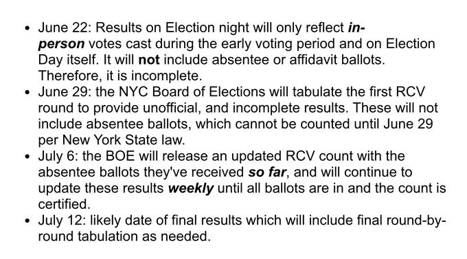 The Board of Election stated the final results will be delivered on July 12 for all elections in NYC. This is going to be a slow and long counting due to the newly setup of ranked choice. Each vote will be counted by several workers and then another group to confirm until the official audit. So until no need for nail biting incidents and try to relax.