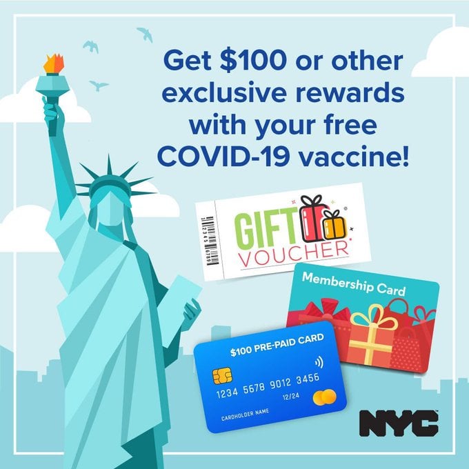 The NYC mayor announced the city will give away $100 to get vaxx at public sites starting Friday. No questions, no prerequisite, no games. Just show up and roll up your sleeves for that first dose. Then get $100 prepaid debit card paid by taxpayers and buy that happy meal. Best yet, a vaxx card. Yay. Enjoy.