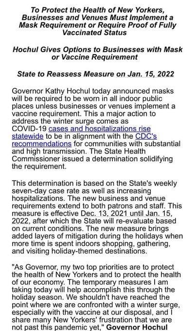 New York Governor Hochul is implementing a mask mandate in indoor public spaces unless the business or venue requires vaccination for entry.