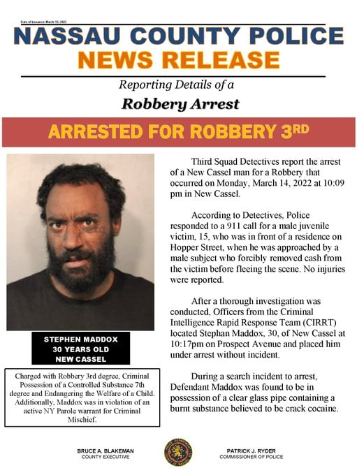The NCPD reports the arrest of a male for allegedly robbing a 15 year old in front of his house in New Cassel. This is near Westbury in Nassau County. The male had open warrant for violation of parole.