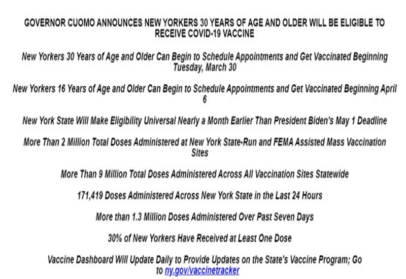 Starting Tuesday, April 6 at 8am, all New Yorkers age 16 plus will be eligible to schedule and receive the vax. And beginning tomorrow at 8am, all New Yorkers age 30 plus will be eligible to schedule and receive the vax. The NY governor announced today.