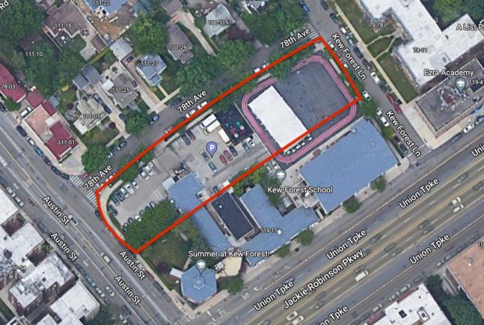 The lot on the corner of 78th Avenue and Austin Street which has parking and a playground for the local school will be demolished pending approval to make way for a residential tower.