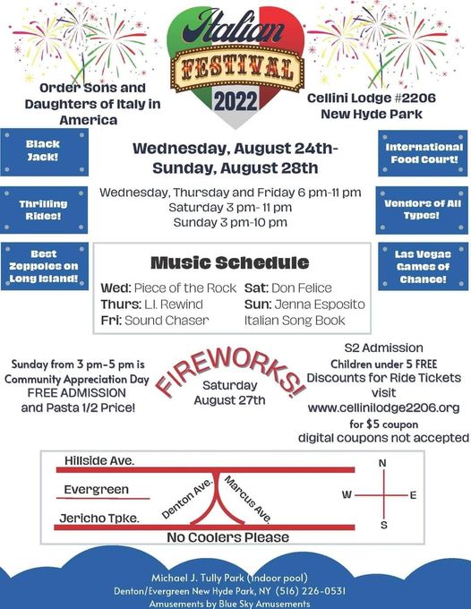 Starting Wednesday, August 24 to August 28 there will be an Italian Festival in New Hyde Park. Tickets are $2 and children under 5 are free. This is at Michael Tulley Park. There will be music and amusement rides for all.