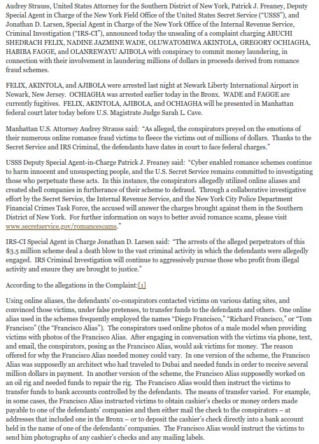 The feds busted 6 suspects for scamming victims who used dating sites by forcing to pay for money laundering. All are facing federal charges after taking into custody. If you have been a victim, contact the US attorney's office. Two were busted at the airport while attempt to leave the country.