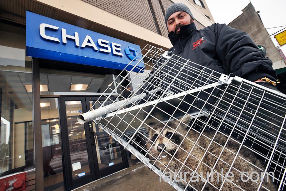 A raccoon intruding inside chase bank in forest hills, Queens.Raccoon felt comfortable which warm inside the bank. A 50 year old man Elkaim snapped photos and clearly observe them. It was standing over the chair in the bank. Finally raccoon trapped by a man from Wildlife removal service.