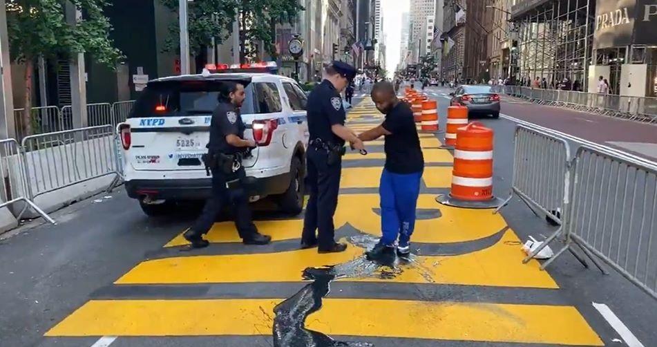 Mayor of NYC is going to keep on painting yellow regardless with tax dollars. NYPD reported the mural in front of Trump Tower in Manhattan was damaged for the fourth time. This time police arrested the man caught in the act with black paint. After two women were arrested for damaging the mural with black paint yesterday, the city's DOT immediately fixed the mural under emergency. Then the mural was damaged and again, DOT fixed it. The fourth incident was also reported yesterday.